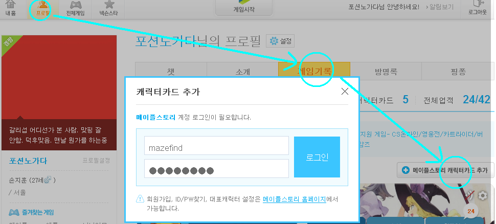 이미 개설이 되어 있다면 프로필 메뉴에서 '게임기록'을 누른 뒤 메이플스토리 캐릭터카드 추가 버튼을 누르면 됩니다. 그러면 위 스샷과 같이 메이플스토리 계정과의 연동을 거칩니다. 이때의 로그인은 넥슨 로그인이 아닌 메이플스토리 로그인이므로 주의.