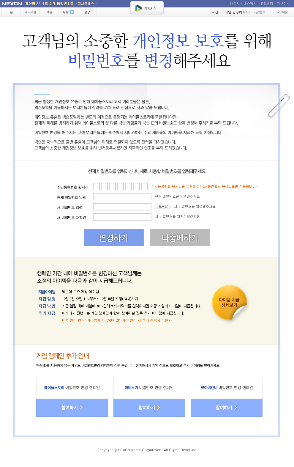 넥슨의 기자간담회에서 언급했지만 비밀번호 변경 캠페인을 후속조치 중 하나로 세웠습니다.