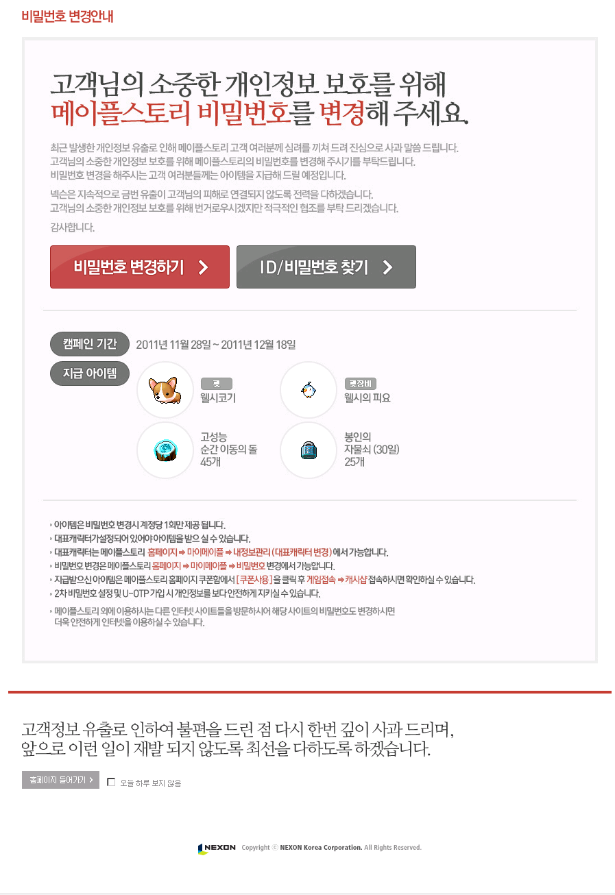 마지막으로 하나 알아둘 점. 지금까지 쭉 말한 비번 변경 캠페인은 이번 개인정보 유출에 대한 보상이 아닙니다. 여기에 관해서는 넥슨 트위터에서 직접 밝혔으며 간담회에서도 말했지만 수사가 마무리되면 보상을 다시 발표하겠다고 했습니다. 이런 보상으로 넘어가려고 하느냐 하고 설레발치시려는 분들은 좀더 기다려주시길.