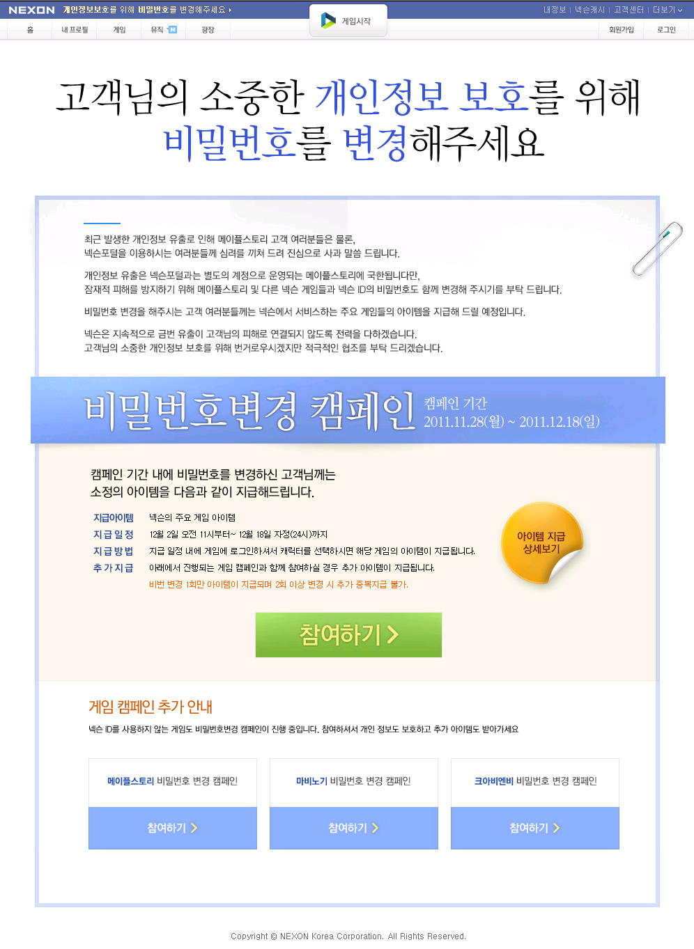앞에서 나온 말대로, 28일 저녁 넥슨 게임 전체에 대한 비밀번호 변경 캠페인이 시작되었습니다. 캠페인 기간은 2011년 11월 28일부터 12월 18일까지이며 이 기간동안 비밀번호를 바꾸면(※1차만 변경하면 되는듯) 다음 아이템을 지급합니다.