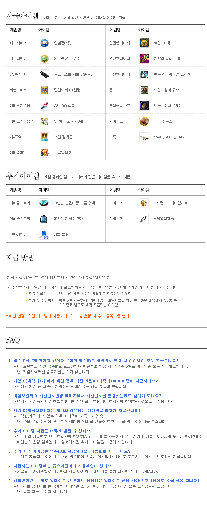 를 받을 수 있습니다. 다만, 이 아이템들은 메이플스토리 비번 변경때와는 아이템 수령 절차가 다릅니다. 요걸로 받은 아이템들은 메이플 홈페이지의 쿠폰함으로 들어오는 것이 아닙니다. 12월 2일부터 18일 사이에 메이플에 로그인한 후 캐릭터를 선택하면 그 캐릭터로 보상아이템을 받을 수 있습니다. 자세한 내용과 기타 사항은 아래 스샷의 FAQ부분 참고. 넥슨에 로그인한 상태에서 위의 캠페인 페이지를 들어가면 각종 인증없이 비번을 더 빠르게 변경할 수 있습니다. 아이핀 인증이 없어지니 이렇게 편할수가[...]