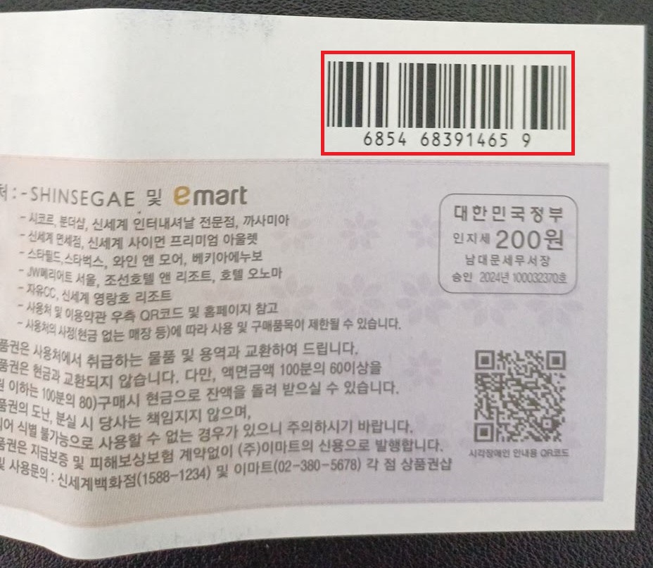 이제 종이 상품권을 스캔할 차례다. 종이 상품권 뒤를 보면 바코드가 있으니 이를 카메라 스캔하면 상품권 일련번호가 알아서 입력된다.