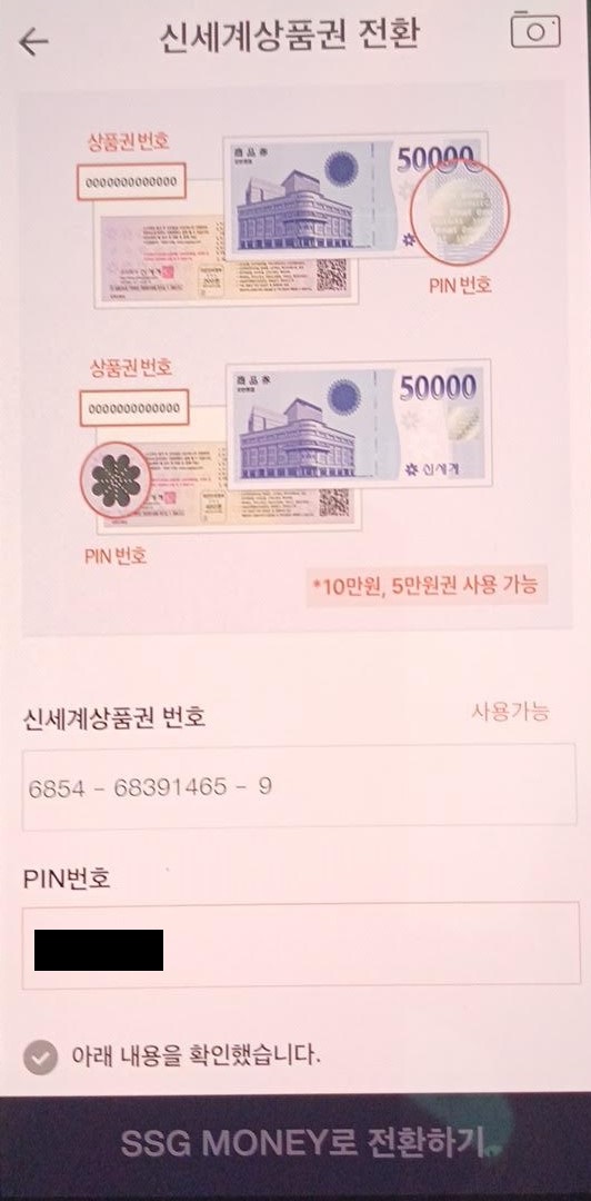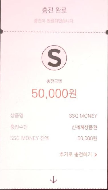 그 다음은 종이로 된 5만원권을 온라인 충전한다. SSGPAY(쓱페이)라는 앱을 사용하니 일단 앱스토어에서 설치한 뒤 신세계 회원가입까지 완료하도록 하자.