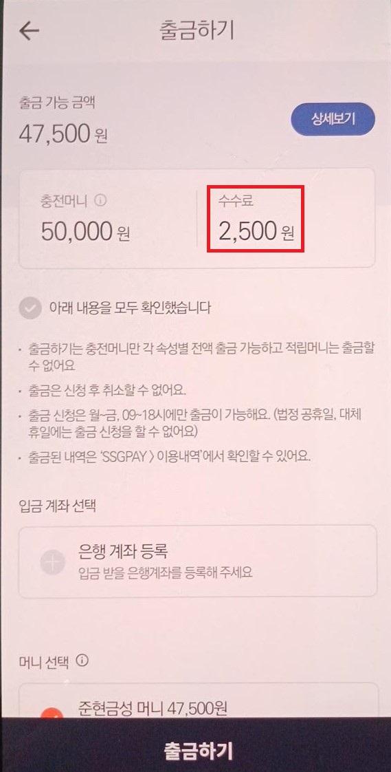 메뉴에 들어간 다음 '쓱머니출금'을 클릭. 들어가면 주의사항이 나오는데 한번 읽어본 뒤 창을 닫는다.