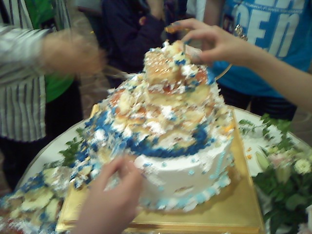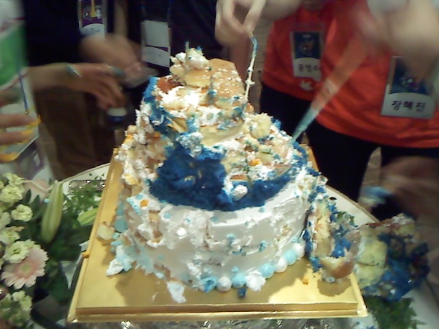 마지막으로 남은 아이팟과 넷북을 추첨으로 보내고 나선 기념촬영과 커팅식. 기념촬영 이후는 동영상으로 찍었는지라 사진으로는 따로 남기지 않았습니다. 아, 케이크는 자르고 나서,
