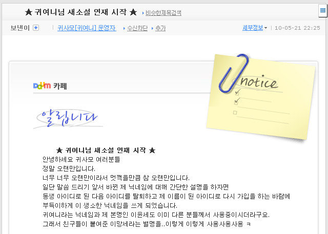 '그놈은 멋있었다' '도레미파솔라시도' '내 남자친구에게' 등으로 이모티콘과 소설이 합쳐지면 어떻게 되는지를 몸소 구현해주신 작가 - 작가로 취급하지 않는 분들도 있지만서도 - 귀여니가 대략 3년만에 연재를 재개한다는 소식입니다. 사실 하는줄도 몰랐는데 카페에서 메일이 와서 알게 되었네요. 2001년에 개설된 카페고 제가 2003년에 들어와서 가입만 해두고 까먹고 있었으니, 저도 일단은 '초기멤버[...]'가 아닐까 싶습니다. 그 가입목적이라는것이 도대체 얼마나 제정신이 아닌 소설을 쓰고 있는지 구경하러 왔다는 점에서 상당히 불순한 멤머였기도 하구요.