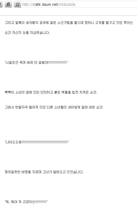 개인적으로는 저 작가의 초기작을 가지고 문장부호가 몇퍼센트나 되는지 따지고 귀여니 빠들의 외계어하고도 씨름을 했던 사람이라서 아직도 이 사람을 바라보는 시선이 고울 수가 없습니다. 하지만 저쪽은 저쪽대로 악플에 익숙하다고 하니, 보는 입장에선 제발 개념박힌 작품이 되기만을 바랄수밖에 없네요.
