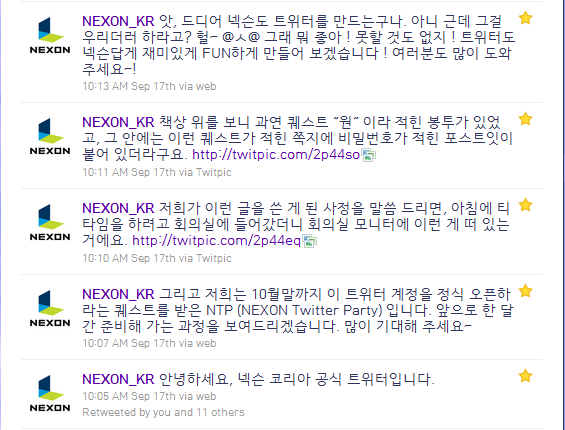 2010년 9월 17일 (드디어) 넥슨 트위터가 오픈했습니다. 그동안에 여러가지 넥슨 트위터가 있긴 했는데(@join_nexon 이라거나 @MabiHeroes (마영전) @nexonstar 등) 공식 기업계정은 없었죠. 위에 써져있지만, 정확하게는 공식 오픈이 아닙니다. 정식 오픈은 아니고 굳이 예를 들자면 클베를 하고 있는 거네요. 앞으로 여러가지 미션이 있을 거라고 하지만 저희랑 관련 있는것이 몇개나 있을지는 미지수. 저는 일단 팔로우하고 지켜보고 있는 중입니다. 트위터 계정은 @NEXON_KR
