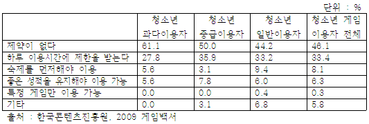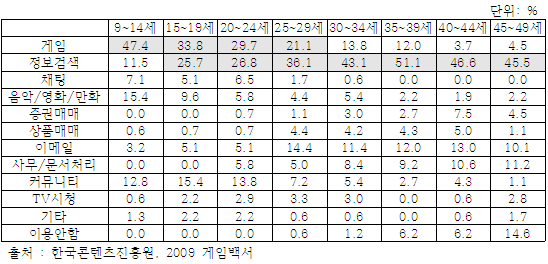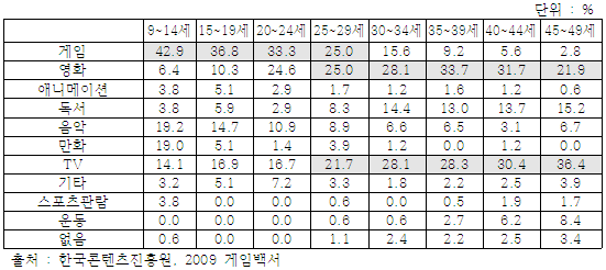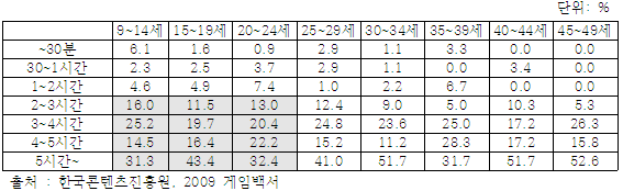 * 이는 2010년에도 비슷한 현상을 보임. 2010년 게임백서 요약본에 따르면 만9~14세 응답자의 82.6%가 게임을 현재 이용하고 있다고 응답하였으며 주중에는 만15~19세, 만20~24세가 2.8시간을, 주말에는 만15~19세가 4.2시간동안 게임을 한다고 응답하였음.