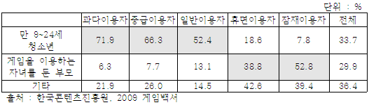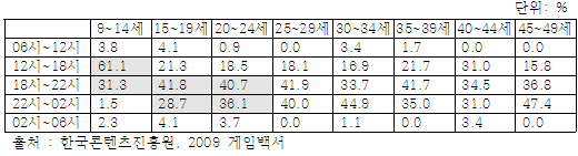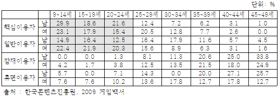 - 이러한 아동·청소년 중독 현상은 게임 분야에서 특히 두드러지게 나타나고 있음. 게임 이용자별 분포를 보면 핵심이용자로 분류된 대상 중 만9~24세는 남자 70.1%, 여자 56.4%였으며, 일반이용자로 분류된 대상 중 만 9~24세는 남자 43.8%, 여자 64.6%로 나타남. 이들 게임이용자의 하루 평균 게임 이용시간을 보면, 2시간 이상 게임을 하는 이용자의 비율이 87%, 90.9%, 88%임*