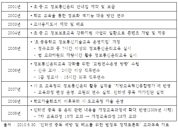 - 이에 교육과학기술부에서는 2000년부터 꾸준히 ‘인터넷중독 관련 예방교육’을 실시하고 있음. 2010년 3월에는 교과부를 포함한 7개 관계부처가 ‘인터넷 중독 예방 및 해소 종합계획’을 수립하고 공동 대응하기로 함.