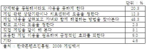 - 따라서 강제적인 조치를 취하는 것보다 해당시간에 게임보다 좀 더 생산적인 여가생활을 즐길 수 있는 수단을 알려주고 권장하는 교육정책이 요구됨.