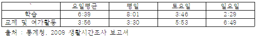 - 아동·청소년층은 학생이라는 특성상 학교 수업이 진행되는 시간대에는 게임을 하는 것이 불가능함. 더욱이 학교가 끝난다고 해도 대부분의 학생들이 학원을 다니고 있고 학교에서 야간자율학습을 하는 경우도 있으므로 실제 귀가 시간은 저녁~밤 시간대인 경우가 많음. 여기에 생활에 필요한 시간(식사, 수면 등)을 제외하면 실제 여가시간은 3시간 정도밖에 없음.