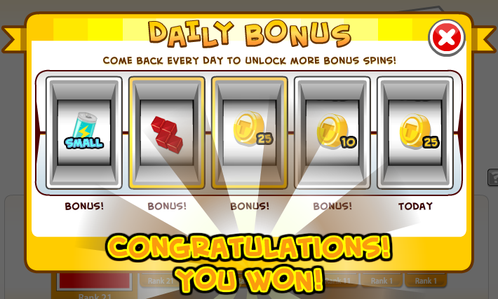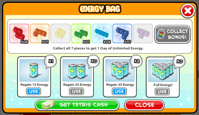 이 게임을 시작하고 매일 접속하면 그 날 처음 접속할때마다 보너스를 줍니다. 처음엔 1개만 주는데 매일 들어오면 5개까지 확장되네요. 게임머니는 물론 충전팩도 주고 테트리미노를 모아서 1동안 에너지 제한 없이 게임을 즐길 수도 있습니다.