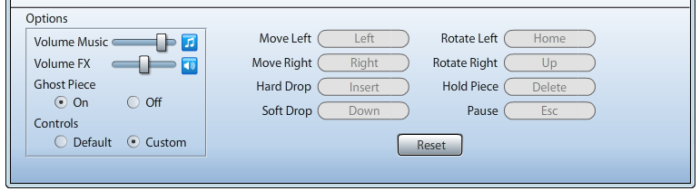 게임 플레이 오른쪽의 작은 버튼을 누르면 '옵션'이 나옵니다. 여기에서 소리 설정이나 고스트 유무, 키보드 설정 등이 가능. 테트리스는 현재 표준 방식이 '우회전'으로 되어 있고 기본 설정도 우회전입니다. 근데 현재 TTC의 인증을 받은 '한테' 이전의 테트리스는 전부 '좌회전'이라 아직도 이 키셋을 고집하는 분들이 많더군요'ㅅ'; 제 경우는 다 귀찮아서 원핸드 키세팅을 합니다[...]