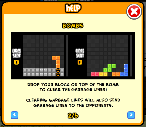 이게 무슨 말인지 모르겠다면 옵션을 켜놓고 몇판 해보신 다음 다시 읽어보시길[...] - OFF : 폭탄 옵션을 끄면 켤 때와는 다른 신세계가 펼쳐집니다; 이떄는 폭탄 블록도 없이 그냥 꽉 채워진 블록이 올라오게 되는데요. 이를 없에려면 2콤보 이상을 하거나 트리플, 테트리스를 성공시켜야 합니다.