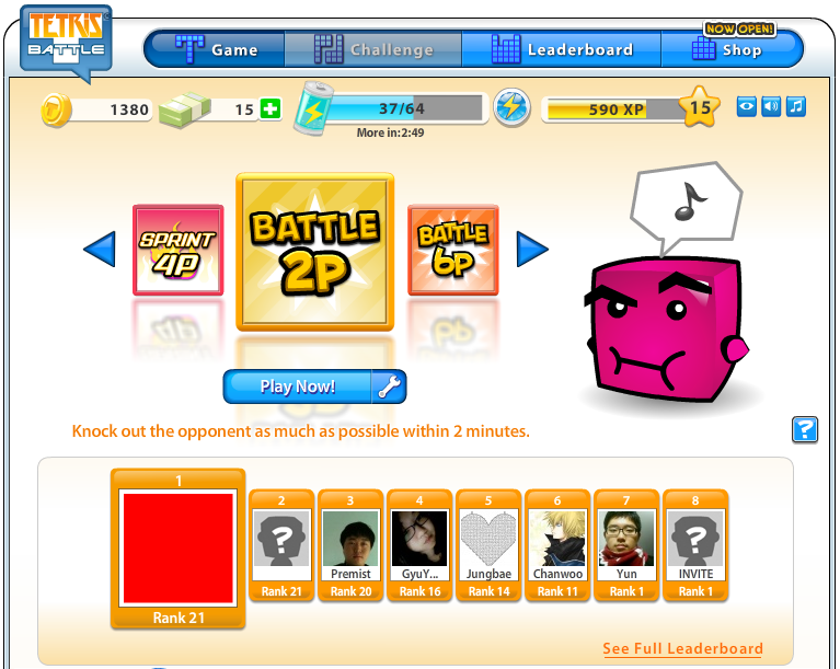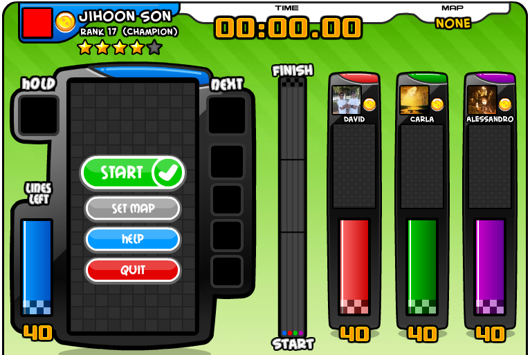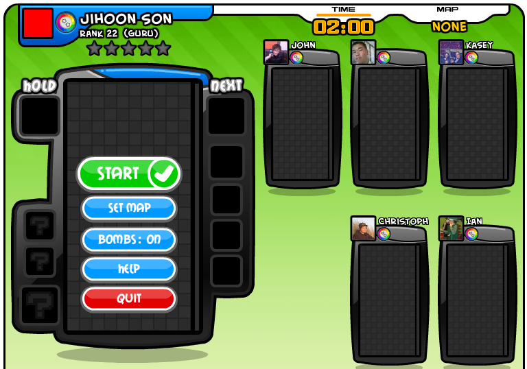 그리고 페이스북에서 친구인 사람이 테트리스배틀을 시작했다면 게임 하단의 친구창에 랭크와 승수(____w라고 표시됩니다)에 따라 정렬이 되는데요 게임 플레이 버튼을 누른 후 게임을 시작하기 전에 invite를 눌러 친구를 초대하면 상대를 강퇴시키고 그 친구와 붙는 것이 가능합니다. 이 때는 랭크차이와 관계없이 게임을 하는 것도 가능하더군요.