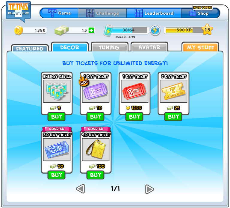 일단 화면 위쪽을 보면 게임/리더보드/숍이 보이는데 리더보드의 경우 랭킹 표시와 비슷합니다. 숍을 누르게 되면 이런 식으로 게임에 필요한 아이템들을 살 수도 있고 게임 내 테트리미노와 고스트 표시를 바꿀 수 있습니다. 일부는 게임머니로도 구입가능하나 캐시를 써야 할 때도 있는데요. 캐시는 경험치가 쌓여 레벨업할때마다 1씩 지급하니까 너무 무리해서 충전할 필요는 없을 듯 합니다. 오히려 게임머니쪽이 더 짜게 주는 듯한 느낌이 드니까 1일 무제한권은 너무 남발해서 사용하지 말도록 합시다.