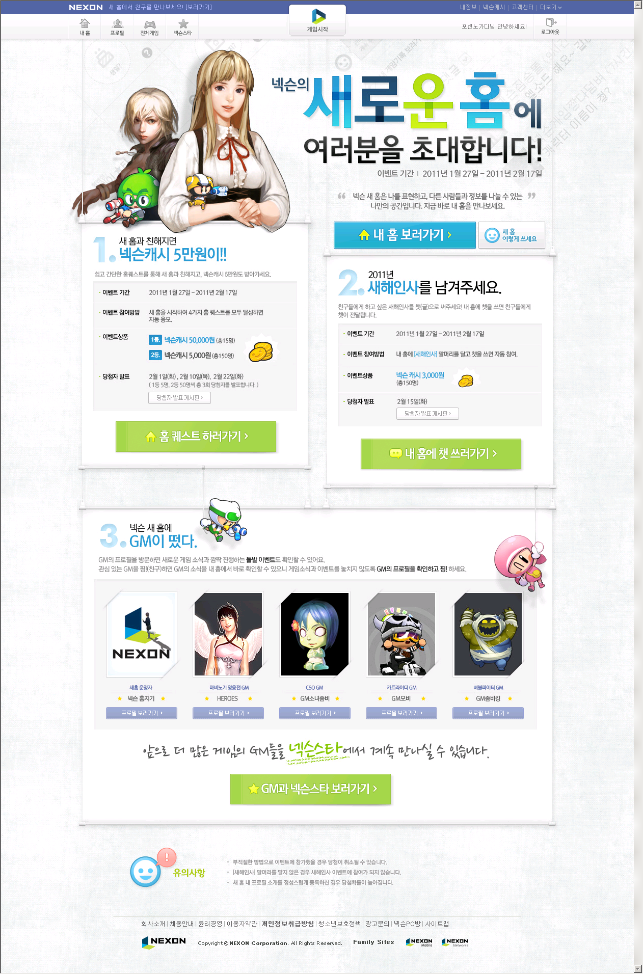 2011년 1월 27일 넥슨 홈페이지가 점검 후 새 서비스를 오픈했습니다. 기존 메인은 그대로 유지하는 대신 자체적인 SNS서비스를 탑재한 신규 메인 홈페이지를 선보였습니다. 덤으로 넥슨캐시 5만원이 걸린 이벤트도 진행중입니다. 이벤트 관련 사항은 좀더 아래를 내려보시길 바랍니다요.