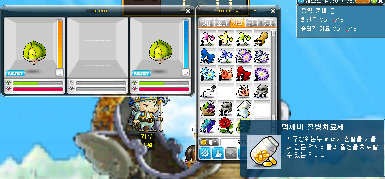 질병을 치료하기 위해서는 ‘먹깨비 질병치료제’라는 기타아이템이 필요하다. 앞서 말했지만 이 아이템은 마이스터빌 잡화상에게서 구할 수 있다. 먹깨비를 더블클릭으로 장착할 수 있듯이 질병치료제도 더블클릭하면 해결할 수 있다. 특히 대륙간을 이동하는 배 안에서는 이 방법을 써야만 한다.