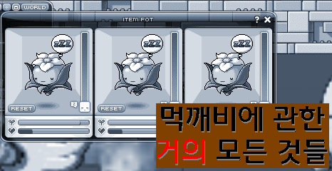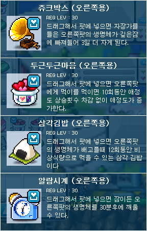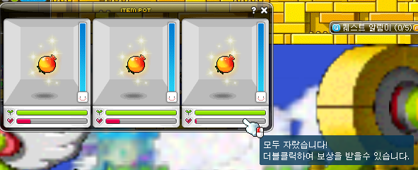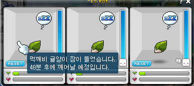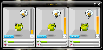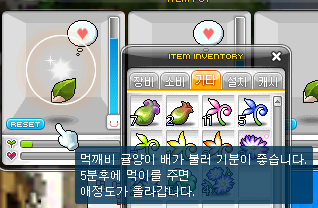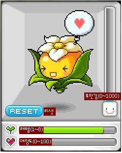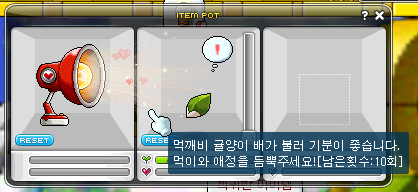 아이템팟 창에는 포만도와 애정도, 레벨이 표시되어 있다. 레벨은 8까지 올릴 수 있고 애정도는 100까지 올릴 수 있다. 포만도는 1000까지 존재한다. 먹이를 주면 포만도가 올라가며 1000을 채울 경우 21시간동안 잠들고 잠에서 깨어나는 순간 레벨이 올라간다.