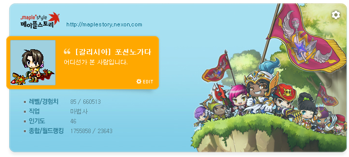 로그인을 통해 연동이 성공하면 가장 위의 스크린샷처럼 자신이 대표캐릭터로 설정한 캐릭터의 스샷과 레벨/랭킹/인기도가 공개됩니다. 이는 이후 비공개가 가능합니다.