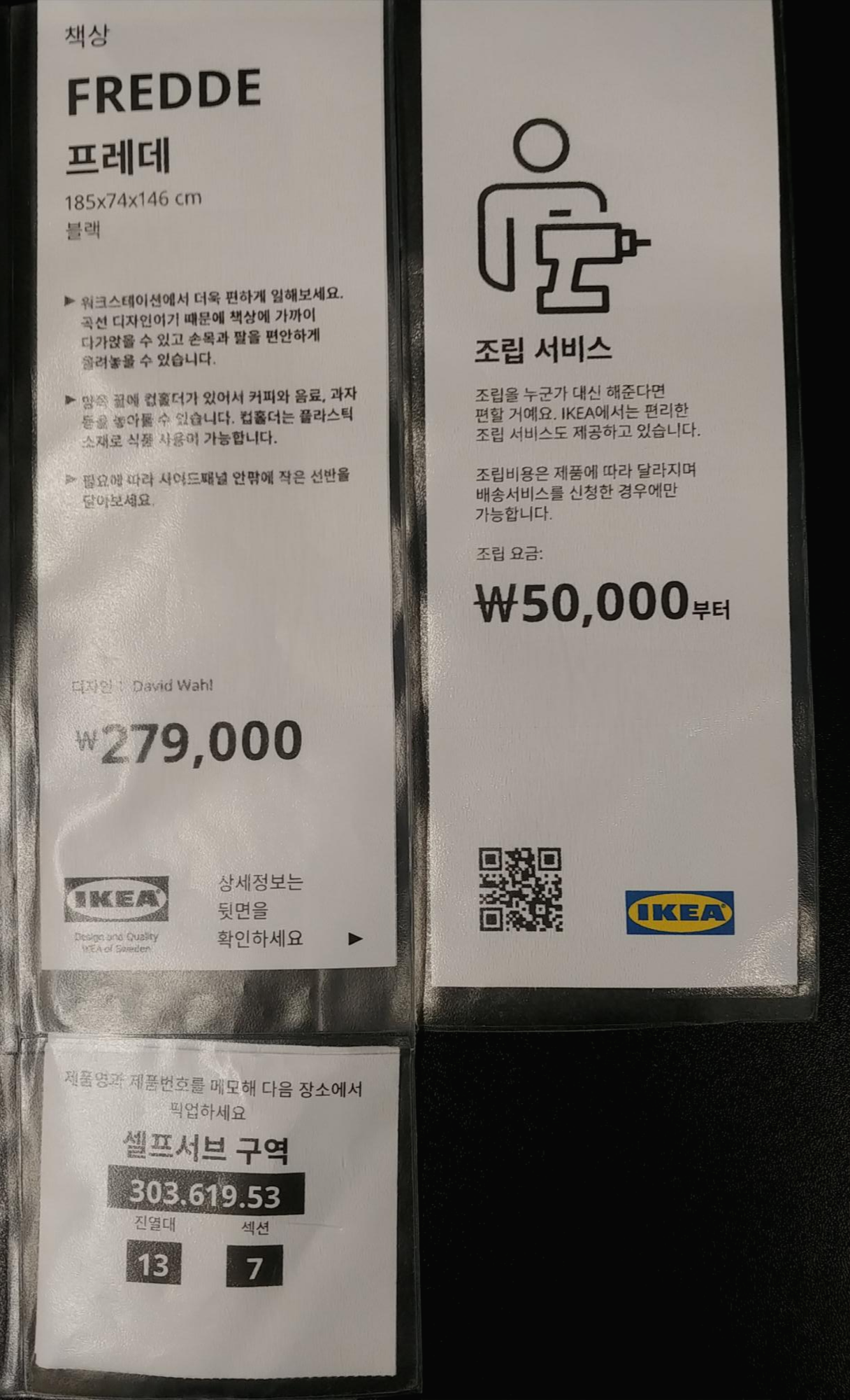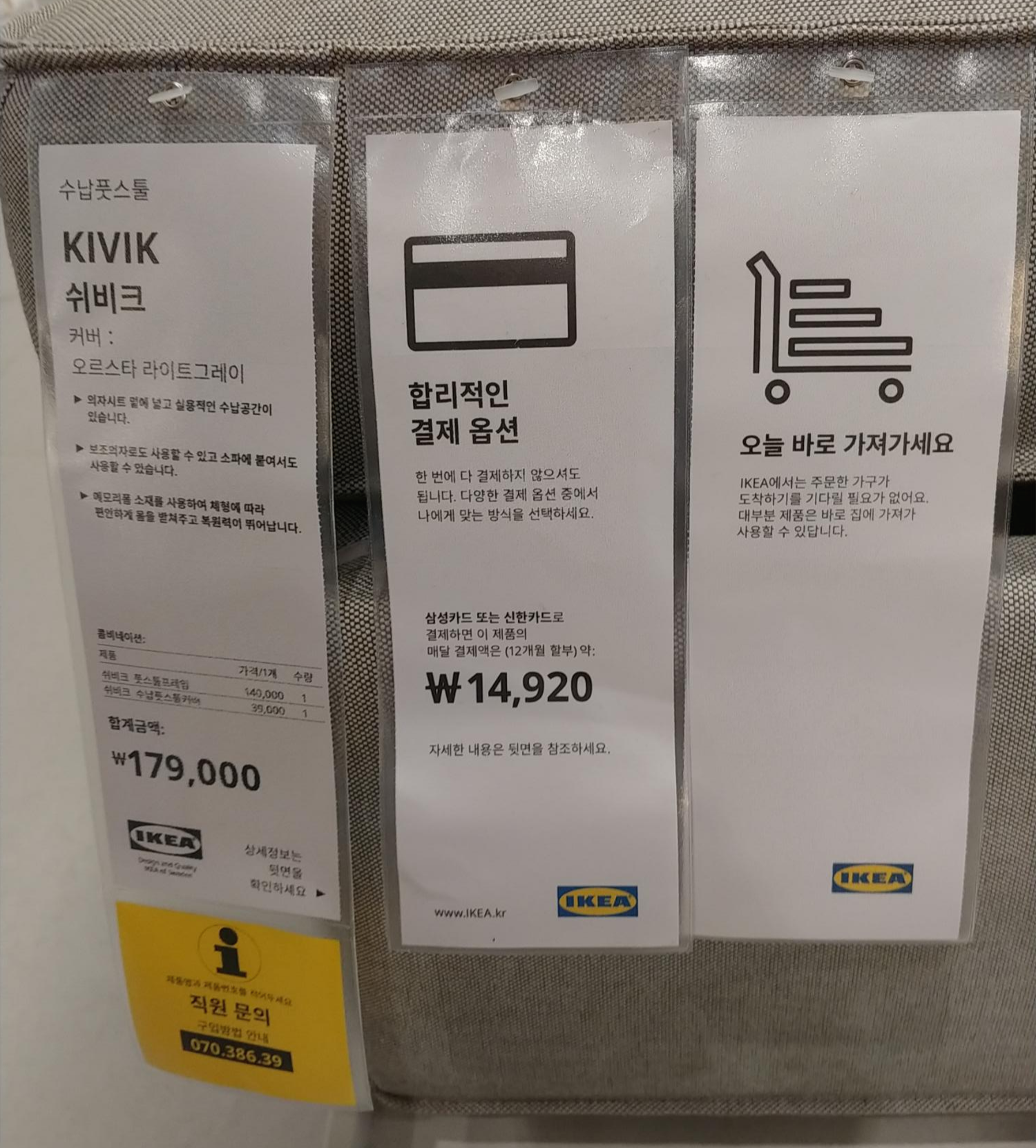 그리고 이케아에서는 가격표를 잘 봐야 한다. 일단, 전시는 해 놓았지만 일시 품절인 상품이 꽤 있는데 이걸 알려주는 유일한 단서가 가격표. 또한 가격표에 특정 유닛이 합쳐져서 이 가격이라는 것도 알 수 있고, 즉시 구매(픽업)가 가능한 경우 그걸 1층이나 2층 어디서 찾을 수 있는지도 가격표에 붙어 있다. 메모지를 주긴 하는데 제일 좋은 건 가구 전체샷 하나 사진찍고 가격표 글자 잘 나오게 사진찍고 하면서 저장하는 것이 가장 좋은 듯.