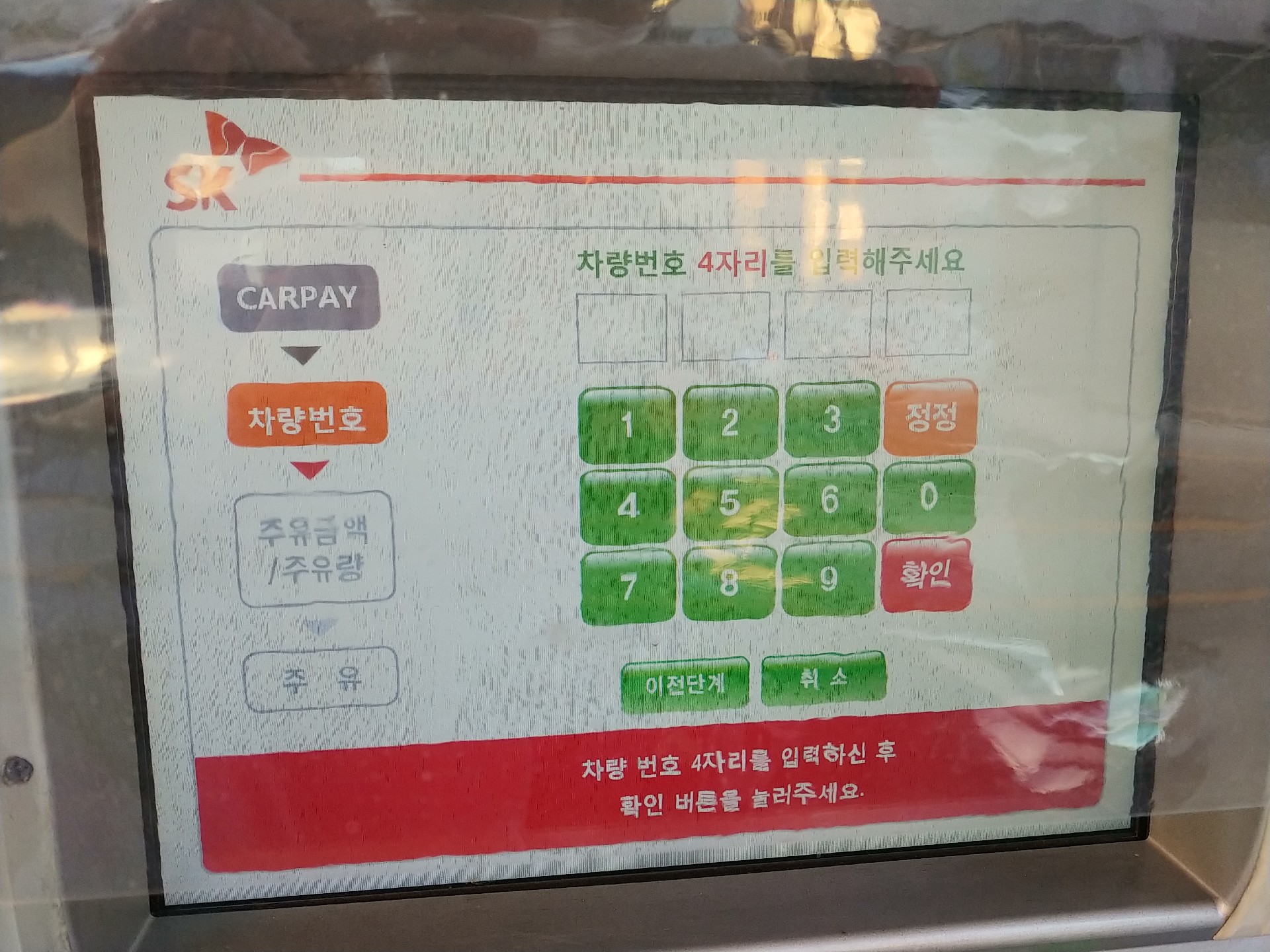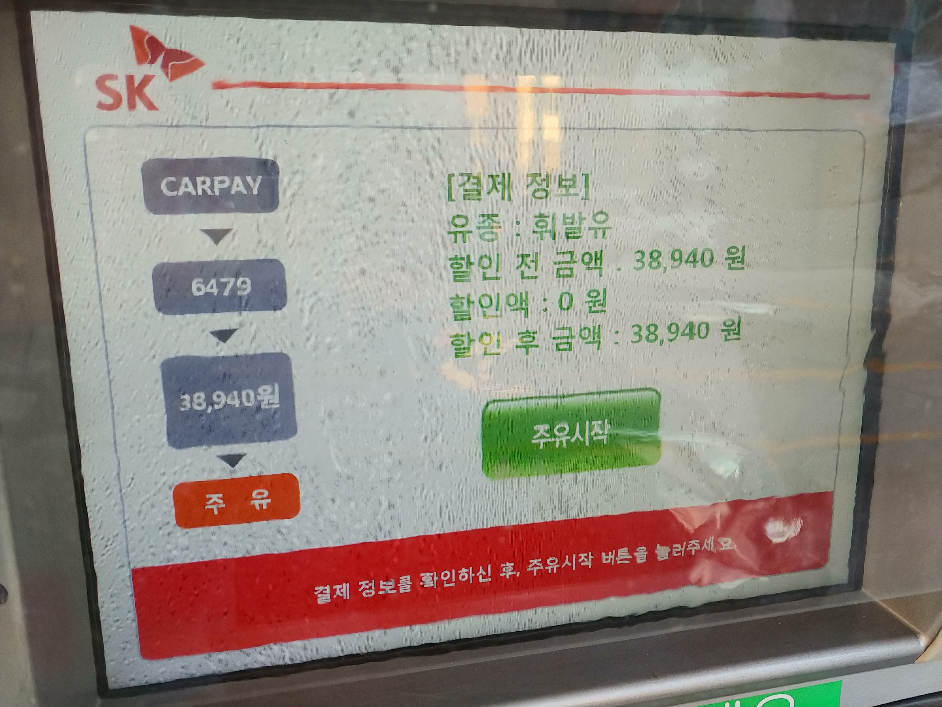 그 다음에 주유기로 가서 'CARPAY'를 누르고 차량번호 끝자리를 치면 결제내역이 나오고 바로 주유가 가능.