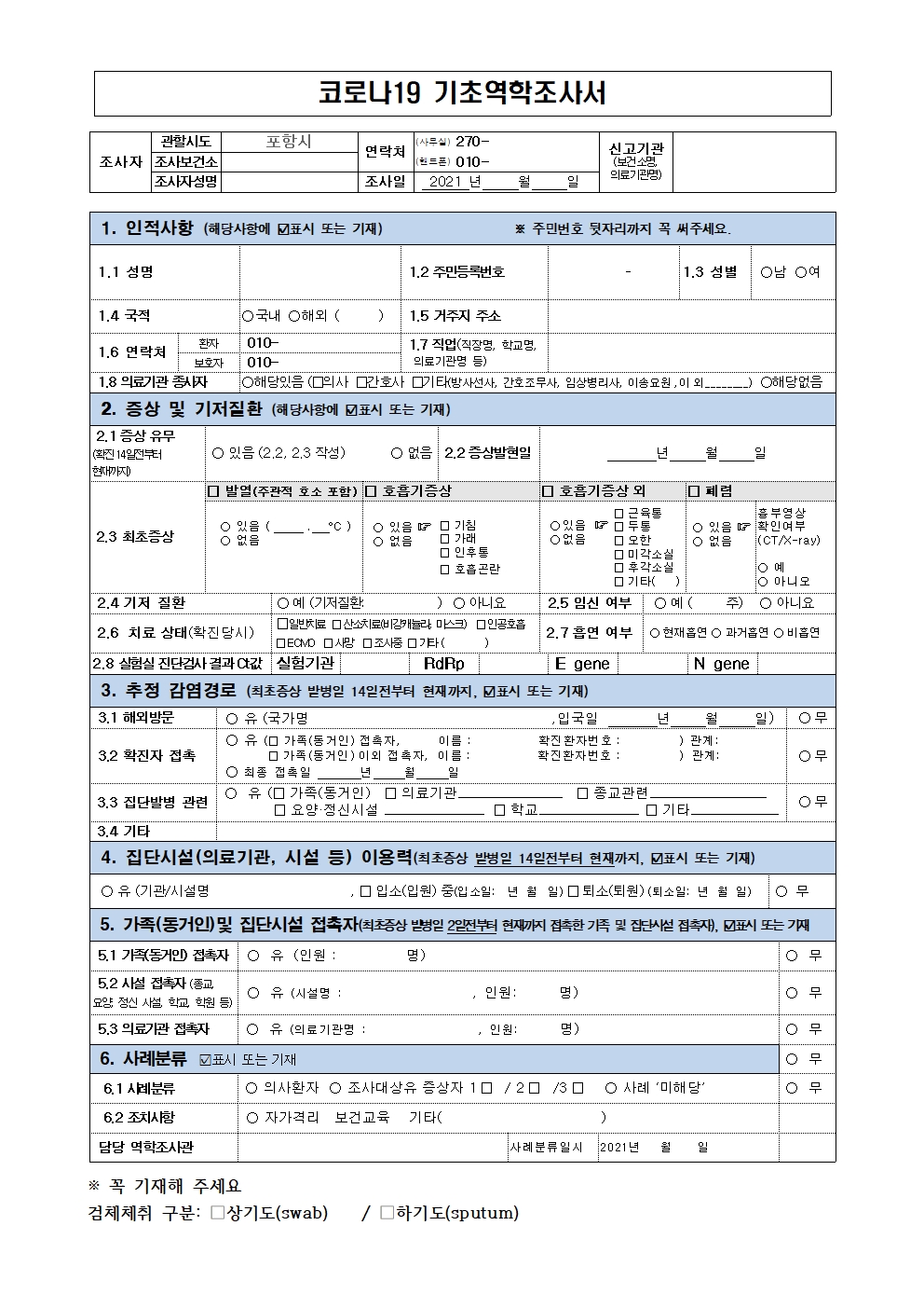 동지역 전역 및 연일읍, 흥해읍의 소재지에서 주거와 생계를 같이하는 가구 구성원중 1인은 지체없이 선별진료소에서 코로나19 검사를 받을 것