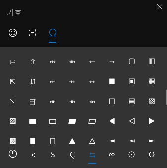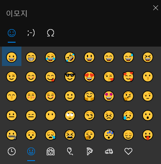 여기서 상단의 메뉴를 누르면 우리가 일반적으로 아는 이모티콘이나 ㅁ+한자키 로 사용했던 특수문자들도 사용이 가능하다. 나중에 적어보겠지만 ㅁ뿐 아니라 다른 자음과 한자키 조합으로도 특문을 사용할 수 있는데 Win키+마침표 입력창의 특문은 자음+한자키 조합보다 쓸 수 있는 범위가 좁다. 그냥 자음별로 어떤 특수문자가 들어가있는지 외우는게 더 효율적.