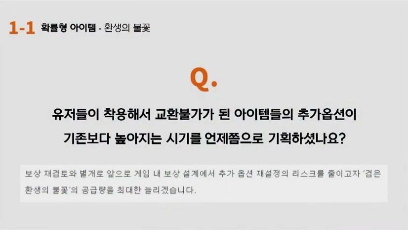 강원기: 저희가 예상했던 부분들은 아이템 가치에서 최대 50% 내외 정도로 생각을 했었습니다. 그리고 사실 이번에 수정을 하면서 균등확률로 수정했다는 부분보다도 저희가 이후에 지급했던 환생의 불꽃, 보상과정에서 지급된 환생의 불꽃들이 오히려 더 많은 가치 하락을 불러일으켰다고 생각합니다. 이 과정에서 저희가 아이템 가치에 대해서 세심하게 보지 못했던 점에 대해서 지금 이자리에서 다시 한 번 사과를 드리고 싶습니다.
