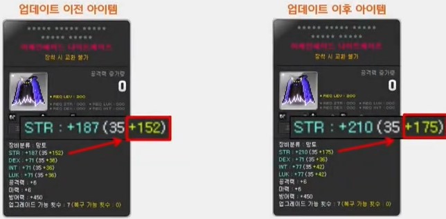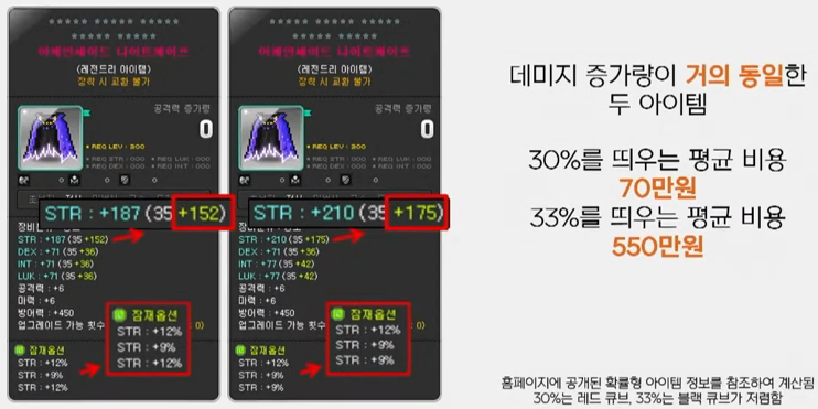 제 사례로 한번 말씀드려 볼께요. 저는 업데이트 이전에 추가옵션 152급의 망토를 추가옵션이 높다는 이유로 구매했습니다. 아이템을 제작하는 과정에서 추가옵션이 높다는 이유로 힘 30%는 전부 다 무시하고 돌린 다음 33% 나올 때까지 돌려서 띄웠습니다. 만약 추가옵션 업데이트 이후에 아이템을 새로 제작한다고 가정을 하게 된다면 화면에 보이는 것처럼 이전보다 높은 175급의 추가옵션 아이템을 구매하겠죠. 잠재능력을 이전과 달리 30%만 띄워줘도 결국은 아이템의 데미지 증가량이 제 아이템이랑 별반 다를 바가 없습니다.