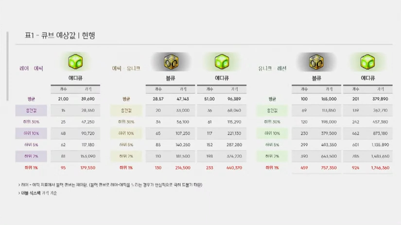 큐브 승급의 경우에는 현재 이렇게 진행되고 있습니다. 이 표는 에디셔널 큐브, 그리고 블랙 큐브를 사용했을 때 등급업시 확률상으로 얼마 정도를 소비해야 하는지 계산한 지표입니다. 보시면 에디셔널 큐브 같은 경우에는 하위 1%의 운이 없는 사람들은 등업에만 할인가로 170만원을 사용해야 하는 수준으로 편차가 지나친 수준입니다.