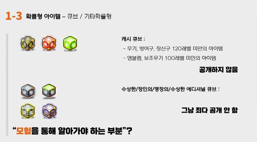 콘파쿠: 네 큐브 이야기 계속 진행해볼까 하는데요. 큐브 이야기 하면 빠질 수 없는 유명한 답변이 있죠. '모험을 하면서 알아가라'. 유저들이 얼마나 많은 것들을 모험, 그러니까 유저 개인의 경험에 기대어 알아봐야 할까요? 큐브의 확률도 공개하셨죠? 하지만 수상한 큐브, 장인의 큐브, 명장의 큐브, 수상한 에디셔널 큐브의 확률은 전혀 공개하지 않았습니다. 지금 화면에 보시는 것과 같이 확률을 공개한 블랙 큐브의 경우도 100레벨 미만 아이템의 확률을 공개하지 않았습니다. 또한 무기와 장신구 방어구는 120레벨 미만 아이템의 확률을 공개하지 않았고 엠블렘과 보조무기는 100레벨 아이템의 확률만을 공개하였습니다. 이 부분에 대해서는 아까 강원기 디렉터님께서 4월 이내에 공개하신다고 하셨는데 맞습니까?
