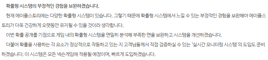 메이플스토리는 3월 5일자 '환골탈태의 각오로 고객님들의 신뢰회복에 전심전력을 다하겠습니다.' 공지에서 확률형 시스템에서 느낄 수 있는 부정적인 경험을 보완해야 한다고 이야기한 바 있습니다. 확률형 시스템에서 하위권 확률을 경험한 유저들은 자신이 운이 없다고 자책하면서 상실감에 젖거나 아예 게임을 떠나버리기도 합니다.