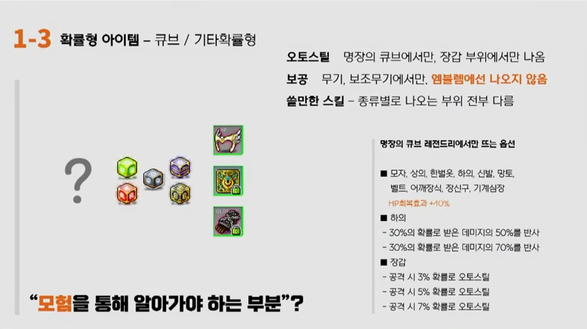 콘파쿠: 그럼 다음으로 넘어가겠습니다. 화면에 보시는 것과 같이 아직 어떤 부위에 무슨 옵션이 뜰 수 있는지도 공개되지 않았습니다. 큐브 확률을 공개하신다고 하셨는데 어떤 부위에 '오토스틸'이 뜨는지 그리고 엠블렘에서는 보공이 안뜨는지 등이 다 명확하게 명시를 하겠다는 걸로 알아들으면 되겠습니까?