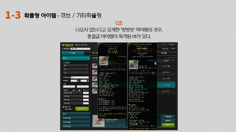 강원기: 정정하겠습니다. 4월에 공개하는 것은 어빌리티에 대해서 저희가 공개한다라고 말씀드렸고 지금 현재 공개순서로 준비중인 것이 저희가 어빌리티를 먼저 하고 나서 그 다음에 레드 큐브랑 블랙 큐브에 대해서 좀 더 확률을 명확하게 보여드린 부분들, 지금 PPT에서 보시면 윗 부분 캐시큐브에 대한 120레벨 미만, 100레벨 미만의 아이템과 장비 파츠별로 좀 더 쉽게 조회할 수 있는 부분들을 추가할 예정입니다. 그리고 이후에 수상한 큐브나 장인의 큐브, 게임 내 큐브에 대해서 공개를 진행을 할 예정입니다.