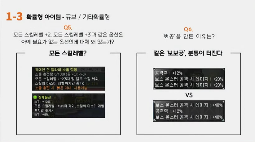 백호영: 그 부분은 제가 말씀드리겠습니다. 큐브에서 어떻게 보면 현재 효용이 없는 옵션인데요. 소울도 마찬가지구요. 이 부분은 큐브 쪽 확률과 옵션이 공개가 되지 않았기 때문에 저희로서도 수정하거나 변경할 수가 없는 부분이었습니다. 이번에 큐브의 모든 옵션과 확률이 공개되었기 때문에 스킬레벨 증가라든지 뾰공이라고 불리는 보스공격력 20% 증가 같은 경우에는 개선이 가능할 것 같습니다. 다만 개선방법에 관해서는 재설정할 때 다시 안나오게 한다든지 하는 개선방법에 관해서는 여러분의 의견을 좀 여쭙고 싶습니다. 고객간담회가 끝나고 고객자문단 여러분께 개선을 어떻게 할지 의견을 여쭤보고 개선을 하고자 합니다.