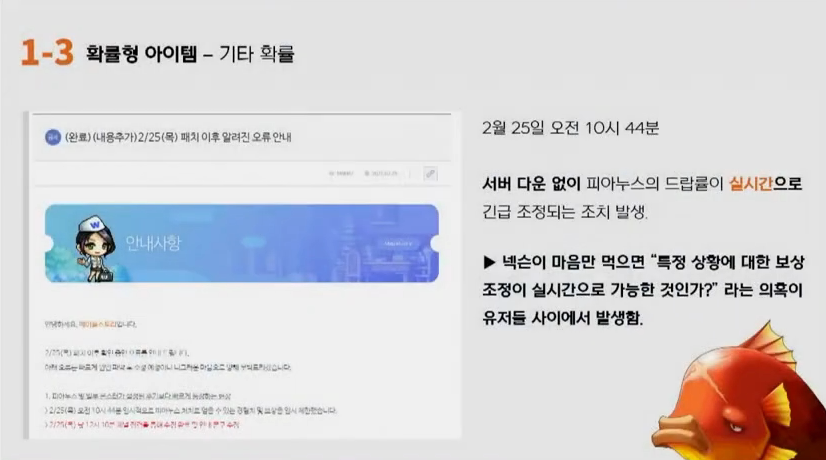 루델팡: 답변 감사합니다. 다음 화면을 보시면 2월 25일 10시 44분에 서버다운이 없이 피아누스의 드롭율이 실시간으로 긴급 조정되는 조치가 발생했는데요. 이로 인해 넥슨 측이 특정 맵과 특정 보스에 대한 확률 조정이 실시간으로 가능하다는 것이 증명이 됐었죠. 따라서 유저들 사이에는 넥슨이 마음만 먹으면 특정 상황에 대한 확률을 실시간으로 조정할 수 있다라는 의혹이 생기면서 아까 말한 변동확률에 대한 의혹이 본격적으로 제기된 바가 있습니다. 이러한 의혹을 피하기 위해서라도 지금이라도 이 사건에 대한 해명을 좀 부탁드리면서 어떠한 방식으로 서버 재시작 등의 조치 없이 드롭율과 경험치 조정이 가능했는지. 혹시 이와 유사한 장치가 다른 보스에도 적용된 사례가 있는지, 적용될 수 있는지. 만일 그렇다면 어떠한 기준으로 작동하며 지금가지 적용된 적이 있었는지 궁금합니다.
