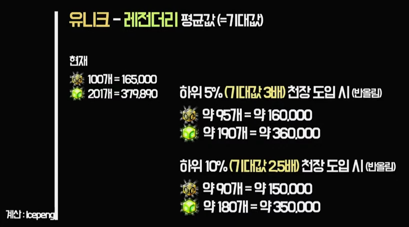큐브 승급의 경우에는 현재 이렇게 진행되고 있습니다. 이 표는 에디셔널 큐브, 그리고 블랙 큐브를 사용했을 때 등급업시 확률상으로 얼마 정도를 소비해야 하는지 계산한 지표입니다. 보시면 에디셔널 큐브 같은 경우에는 하위 1%의 운이 없는 사람들은 등업에만 할인가로 170만원을 사용해야 하는 수준으로 편차가 지나친 수준입니다.