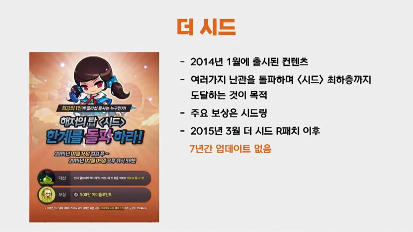 더시드는 2014년 1월에 출시된 컨텐츠로 여러 난관을 돌파하며 시드 최하층까지 도달하는 것이 목적인 컨텐츠입니다. 여러분들이 흔히 아시는 얼티링(얼티메이덤 링)이나 리레링(리스트레인트 링)이 바로 여기서 나오는 것이죠. 보시다시피 2015년 3월 더시드 R 패치 이후 7년간 업데이트가 없는 상황입니다. 이에 질문하겠습니다. 운영진들은 더시드를 직접 해보신 적이 있습니까?