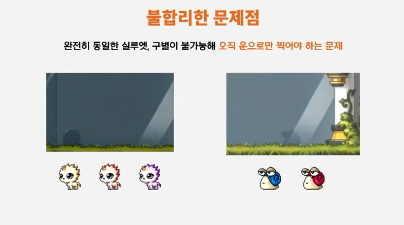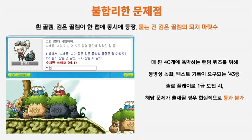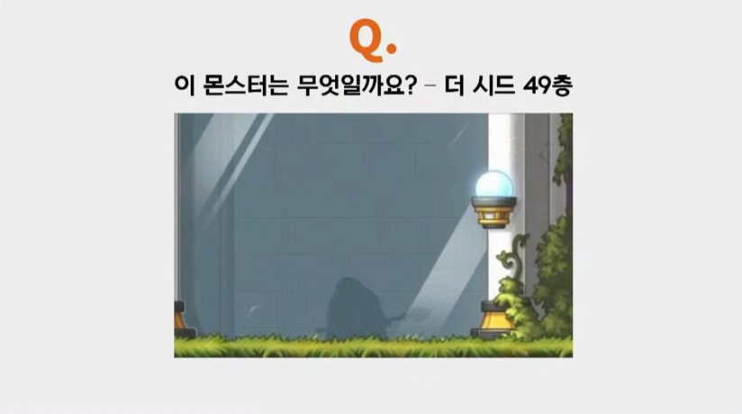 박세웅: 알겠습니다. 다음 질문입니다. 보상 다음 문제로 시드를 열심히 탐험하는 유저분들께서 많이 질문해주신 대표적인 두 문제가 있습니다. 먼저 43층의 문제인데요. 43층의 퀴즈 중 11층의 검은플라워골렘을 몇 마리 잡았는지 묻는 문제입니다. 11층은 흰골렘, 검은골렘이 동시에 출현하는 맵인데요. 검은 골렘을 잡은 마릿수를 물어봅니다. 당연히 마릿수가 표시되는 것도 아닙니다. 도와주는 사람이 없는 경우 녹화를 해도 현실적으로 맞히는 것이 불가능한 문제입니다. 다음 문제는 49층의 문제인데요. 보시다시피 실루엣을 보고 몬스터를 맞히는 문제인데 색깔이 다른, 현실적으로 구별이 불가능한 문제가 나옵니다. 이 두 부분들 유저들에게 정말 불합리하게 느끼는 만큼 개선요청이 있었는데요 이에 대한 생각을 듣고 싶습니다