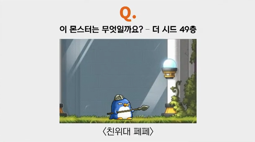 박세웅: 네 맞습니다. 정답은 친위대 페페인데요. 그런데 친위대 페페라는 몬스터는 현재 메이플월드 내에서 몇 년 전에 삭제된 몬스터입니다. 이와같이 삭제된 몬스터가 더시드에 나오는 사실을 알고 계셨나요?