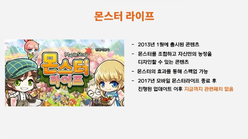 성승헌: 네 여러분 지금 메이플스토리 고객간담회와 함께하고 계십니다. 저희가 준비한 4개의 큰 주제 가운데 두 개의 큰 주제를 소화하고 있는 상황입니다. 이제 두 번째 대주제 가운데 다섯 번째 소주제를 가지고 지금부터 이야기를 나눠보도록 하겠습니다. 더시드, 몬스터라이프 컨텐츠 방치의 내용이 되겠습니다. 이 부분에 대해서는 누가 준비하셨죠? 네 박세웅님이 준비하셨죠. 이 부분에 대해서 발표 부탁드리겠습니다.