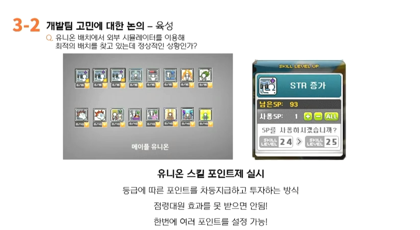 강원기: 그 부분은 쉽게 말해서는 캐릭터 성장이 아닌 계정 성장을 의도하고 만들었습니다. 그리고 이 유니온시스템을 실질적으로 기획했던 분이 김창섭 기획팀장님이십니다. 그래서 좀 더 추가적인 답변은 김창섭 기획팀장님께서 해주시면 좋을 것 같습니다.