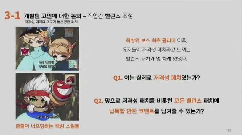 백호영: 먼저 첫 번째 질문에 대해 대답드리겠습니다. 저격성 패치가 아닙니다. 말씀드렸던 것처럼 저희는 이전에는 스킬밸런스 주기가 길었기 때문에 저희가 나름대로의 데이터를 수집합니다. 그랬을 때 말씀드렸던 것처럼 데미지 로그라든지 그런 부분을 수집하는데. 보통 최고의 보스를 클리하는 직업들이 비교적 높은 성능을 지니고 있기 때문에 아마 데미지로그가 많이 높게 남아서 그런 밸런스 방향이 정해지지 않았나 혹은 그런 오해를, 저희가 그렇게 생각하지 않았나 그런 생각이 듭니다. 특정보스를 먼저 격파했다고 저희가 저격성으로 너프해야지 하고 너프하는 경우는 없다고 말씀드릴 수 있습니다. 그리고 두 번째 질문에 대해서 대답을 드리자면 이번 3월 패치에서 개발자코멘트 등이 추가됐듯이 해당 부분에 대해서는 저희가, 특히나 하향 부분에 관해서는 자세한 설명을 적도록 하겠습니다. 이번 3월 업데이트 공지 양식이 변경되면서 좀 더 저희의 생각들을 많이 적을 수 있게 되었는데요. 앞으로는 저희가 어떤 생각을 하고 있는지 많은 내용을 담도록 하겠습니다.