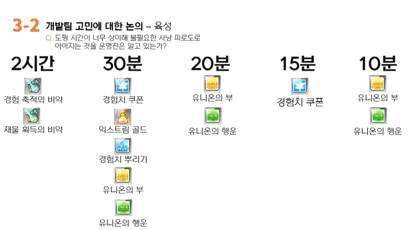 타키매너: 답변 감사드립니다. 이제 사냥 버프 아이템에 관하여 질문할 건데. 버프아이템은 이하 도핑이라고 지칭하겠습니다. 일단 사냥 도핑들의 지속시간이 중구난방하게 상이합니다. 이는 불필요한 사냥 필요도와 이어지며 이에 대해 유저들의 여러 의견들이 있었습니다. 먼저 도핑을 사용했을 때 시간이 중첩되어 적용이 되게 개선해달라는 의견이 있습니다. 두 번째는 재획비(재물 획득의 비약)을 기준으로 2시간 기본 사냥시간이 되어 이에 대한 부담을 느끼는 유저들이 많습니다. 이를 무조건 다 채워서 사냥할 필요는 없지만 대부분의 유저는 비약을 얻는데 들어가는 매몰비용과 낭비되는 재획비 효과가 아쉬워서 2시간을 꽉 다 채워서 사냥합니다. 따라서 1시간이나 30분짜리 재획비, 경축비(경험 축적의 비약)를 만들 수 있게 개선했으면 한다는 의견도 있습니다. 셋째 메이플이 튕길 시에 일부 도핑은 남아있게 패치가 되었으나 여전히 삭제되는 도핑들도 있습니다. 이러한 부분에서 스트레스를 느끼는 유저들이 많고 재접속시에도 그대로 유지되게 해달라는 의견 또한 많았습니다. 앞서 언급한 3가지 개선안을 운영진측에서는 어떻게 생각하는지 알고 싶습니다.