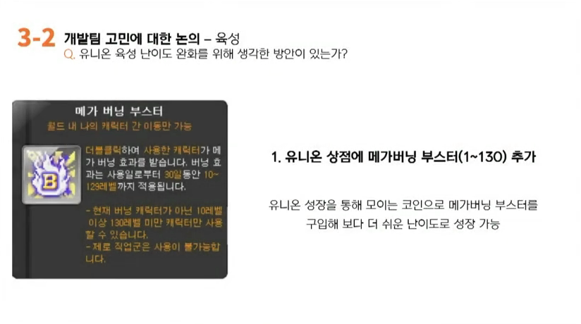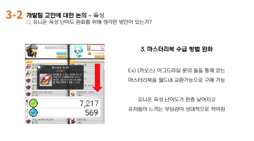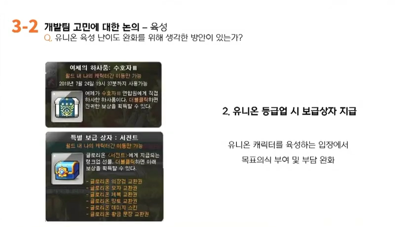 김창섭: 먼저 말씀해주셨던것처럼 현재 유니온시스템의 육성난이도가 매우 높은 수준을 요구하고 있다라는 사실에 대해서는 저도 그렇게 생각을 합니다. 유니온시스템은 앞서 설명드렸던 것처럼 기존의 캐릭터단위의 성장목표를 월드 단위의 성장목표로 확장을 하면서 나아가 정말 최상위 도전목표를 가지신 고객님들이 즐기실 수 있는 컨텐츠로 설계되었던 부분입니다. 그래서 현재 육성난이도가 매우 높은 상태라는 데에는 저도 그렇게 생각을 하고 있습니다.