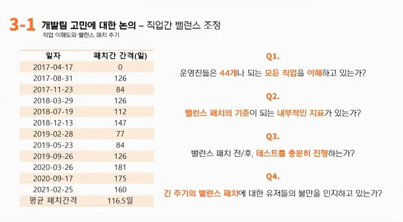 강원기: 여기서 제가 조금만 더 보완설명을 드리도록 하겠습니다. 저희가 4개월에서 6개월정도 밸런스패치를 하게 된 가장 큰 이유가 사실 직업별로 차별없이 웬만하면 모든 직업을 한번에 수정하려고 하다 보니까 그렇게 기간이 길어졌던 부분들도 있었던 것 같습니다. 향후에는 짧은 주기로 백호영 크리에이티브 디렉터님께서 말씀하신 것처럼 짧은 주기로 좀 더 시급한 부분이 있다고 하면 빠르게 빠르게 진행을 하겠습니다. 또한 변동폭을 줄이더라도 저희가 조금씩 바꾸면서 문제가 생기면 바로바로 수정하면서 조금 더 기다리시지 않게 하는 방향으로 개선해나가도록 하겠습니다.