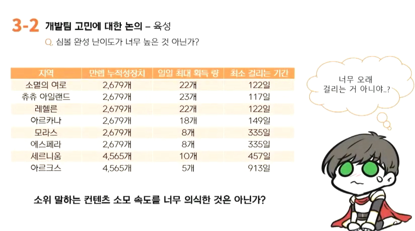 김창섭: 결코 그럴수는 없을 것 같습니다. 저희가 인게임에서 성장과 관련된 어떤 안내들을 각종 시스템이나 메시지 등을 통해 제공을 하고 있지만 해당 내용들만으로는 지금 예시로 가져오신 저런 유튜버님께서 올려주시는 정보들에 비하면 많이 부족한 것 같습니다. 저희가 어떻게 하면 좀 더 친절하게 성장과 관련된 정보들을 고객님들에게 전달해줄수 있을지 그것을 비단 인게임뿐만 아니라 다른 측면에서 제공해줄 수 있는 방법이 있을지 고민하고 말씀드리도록 하겠습니다.